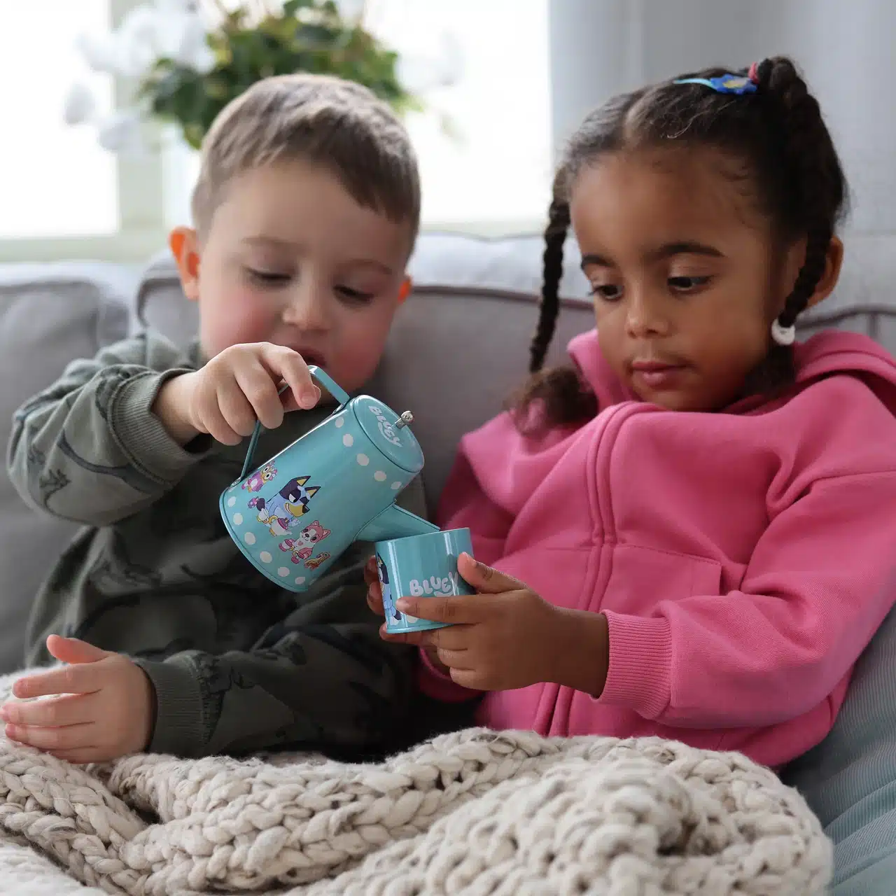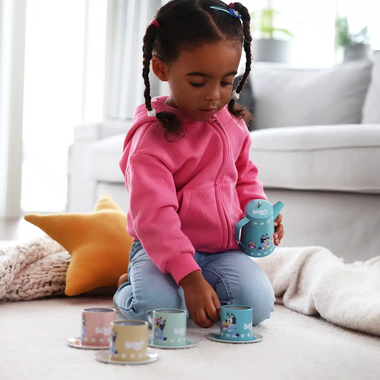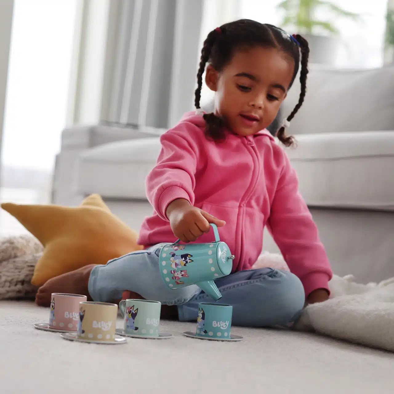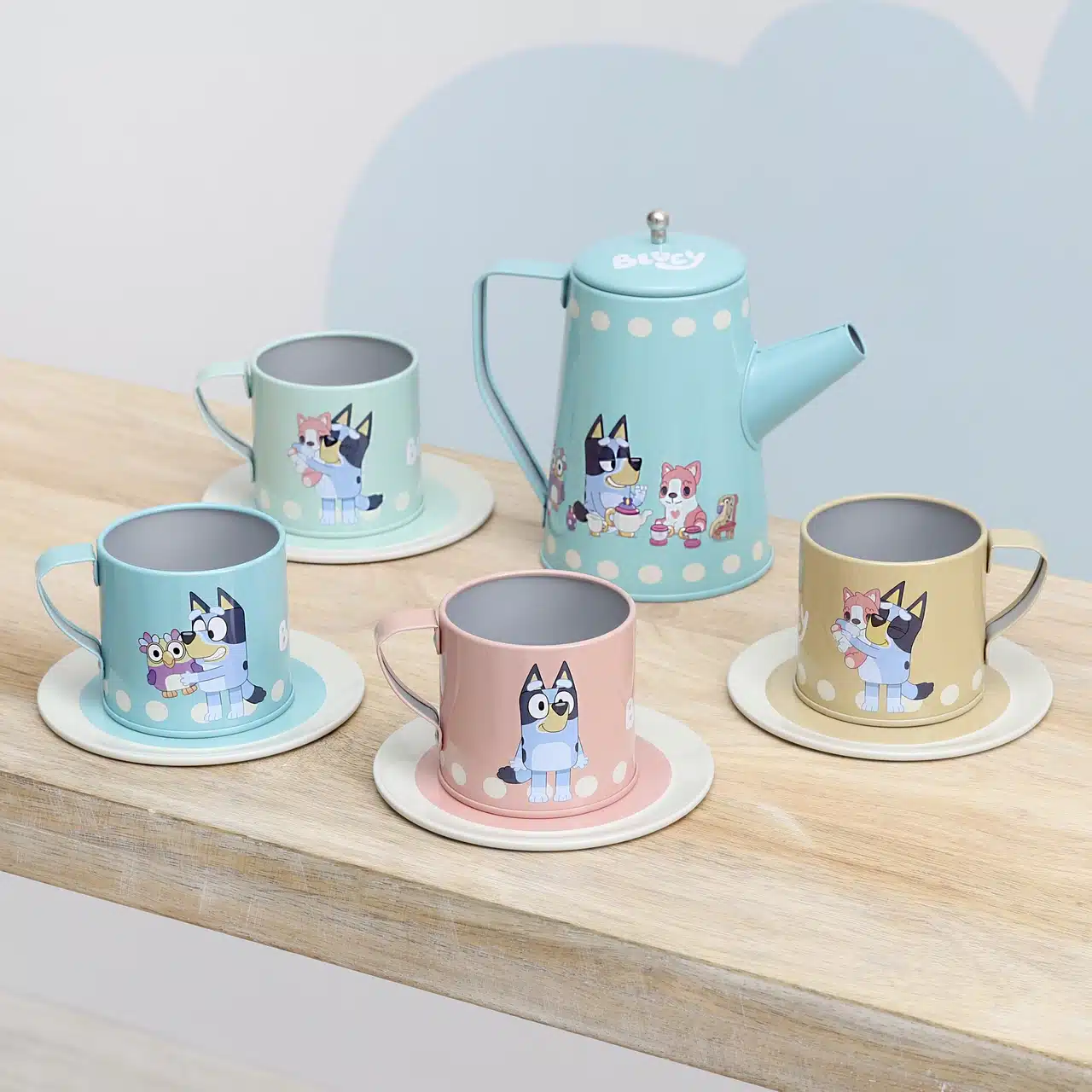 Varje del i setet har en illustration på dom populära karaktärerna från Bluey. Setet innehåller en kanna med lock, 4 koppar och 4 fat. Denna tåliga leksaksservis inspirerar till fantasifull rollek med Bluey och hennes vänner.