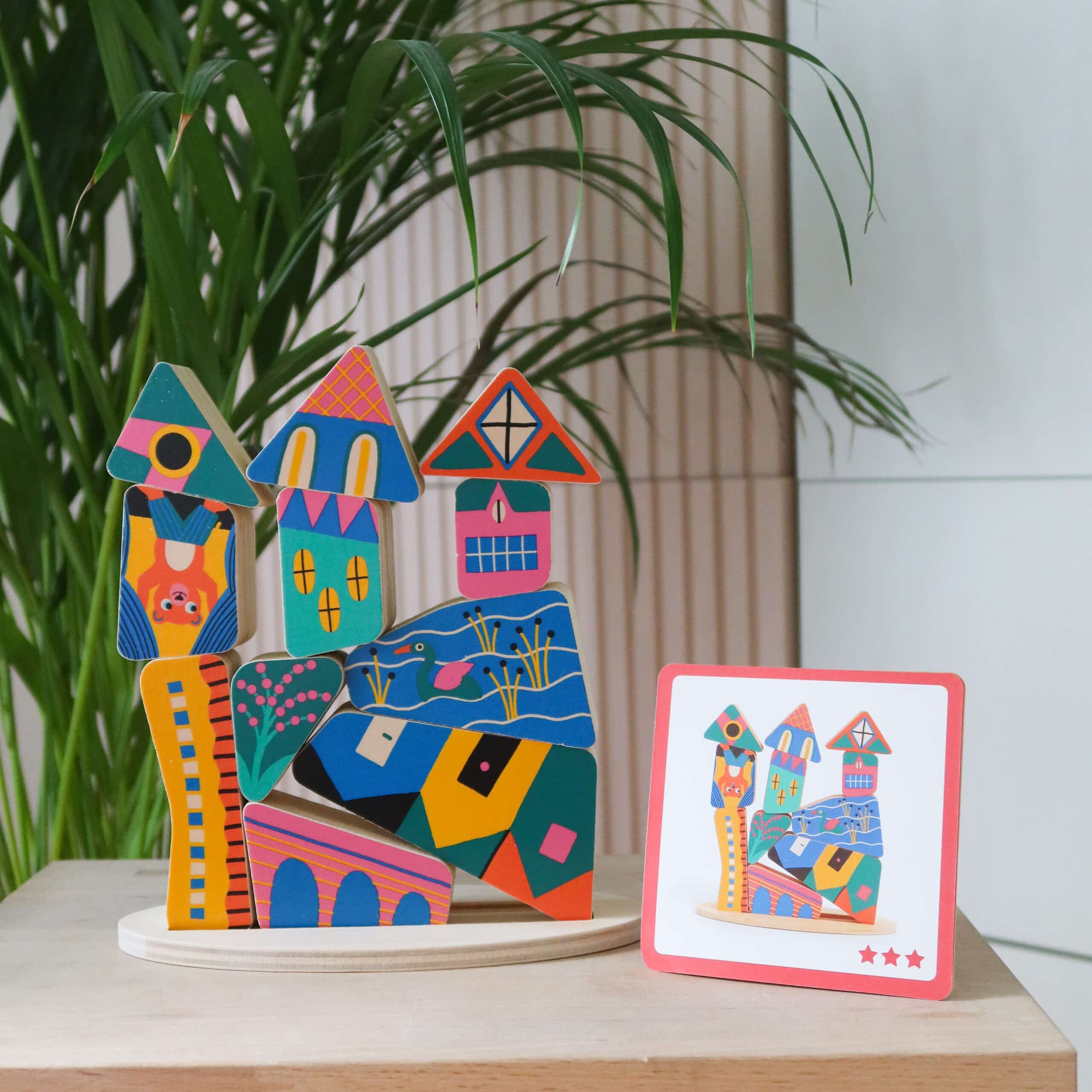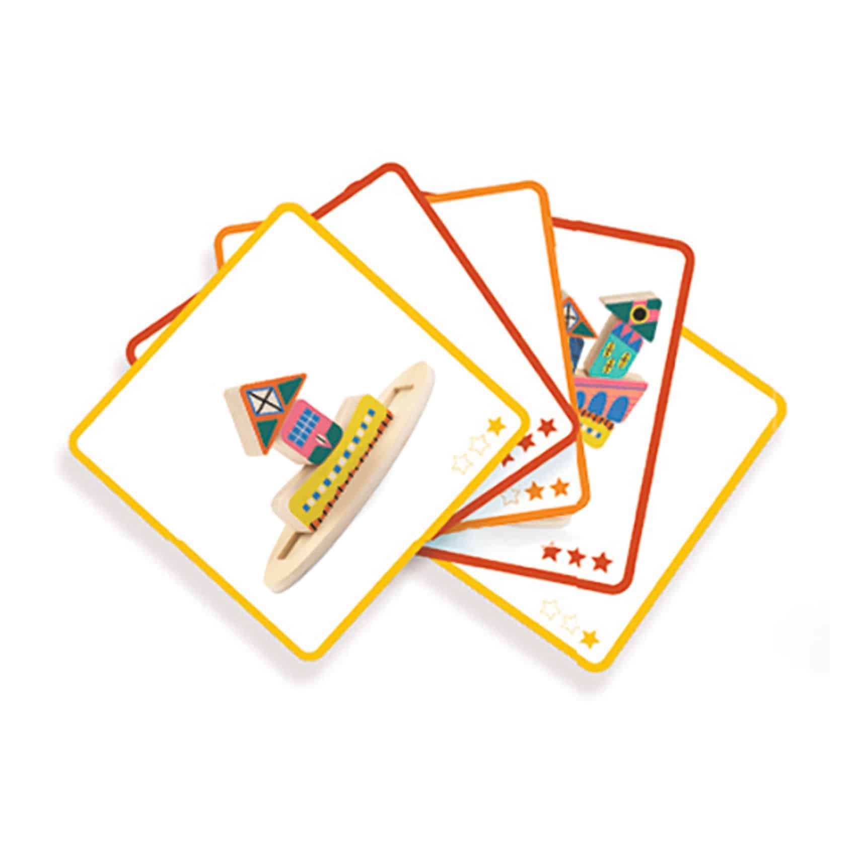 Ze Stakaboom är ett konstruktions-spel av trä där yngre barn kan lära sig om begreppet balans medan de återskapar strukturen som visas på korten med utmaningar med hjälp av de ojämnt formade bitarna i trä. Se till att placera bitarna på rätt plats och vända åt rätt håll, annars faller allt! Den medföljande basplattan av trä har en grund skåra som håller de nedersta bitarna på plats och ger en bra bas för att fortsätta bygga uppåt.