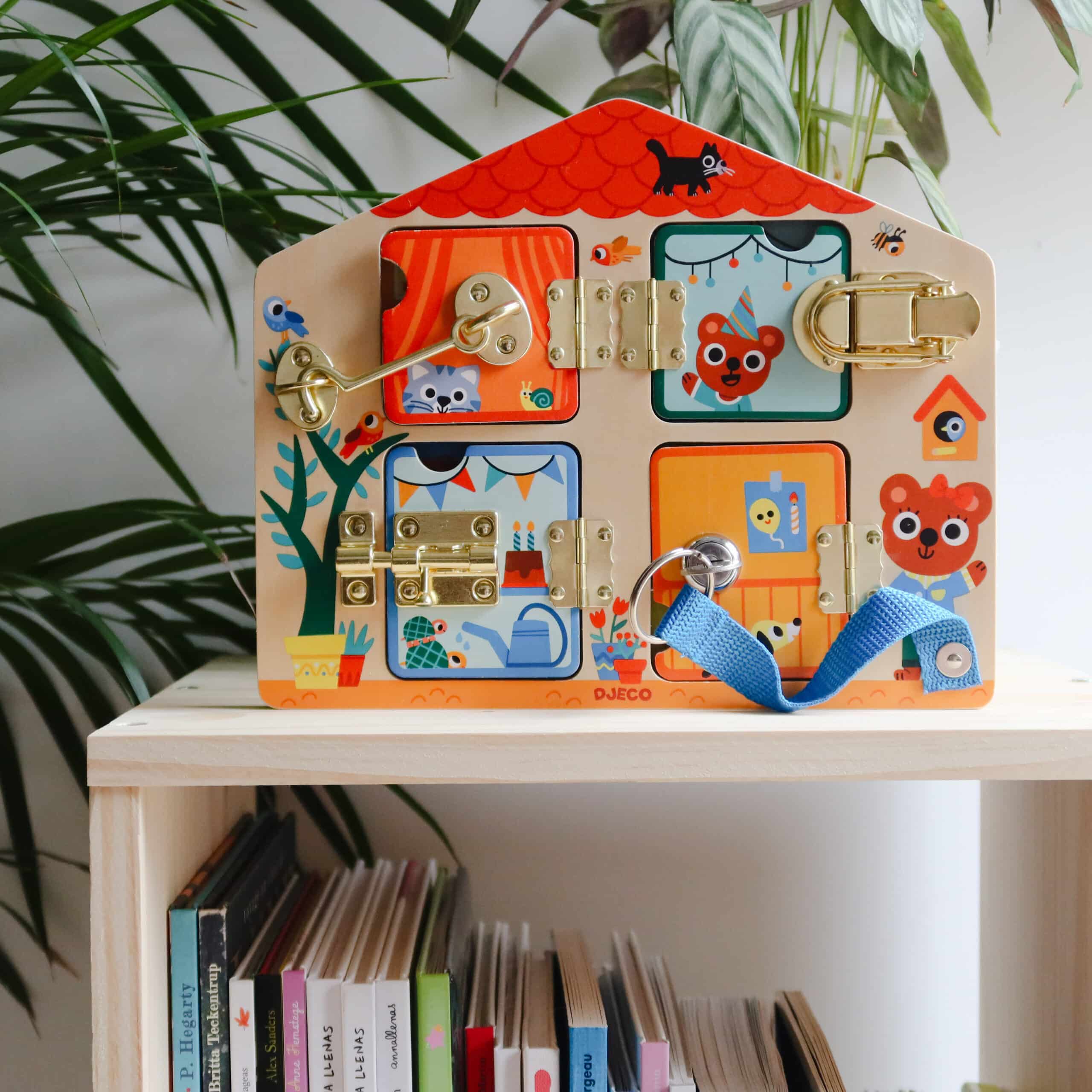 Utforska och lek med Djeco Cabanalock Aktivitetstavla – en pedagogisk leksak i trä som låter barnet öppna dörrar, vrida lås och upptäcka hemliga utrymmen. Aktivitetstavlan utformat som ett hus med 4 luckor som barnet ska försöka öppna.