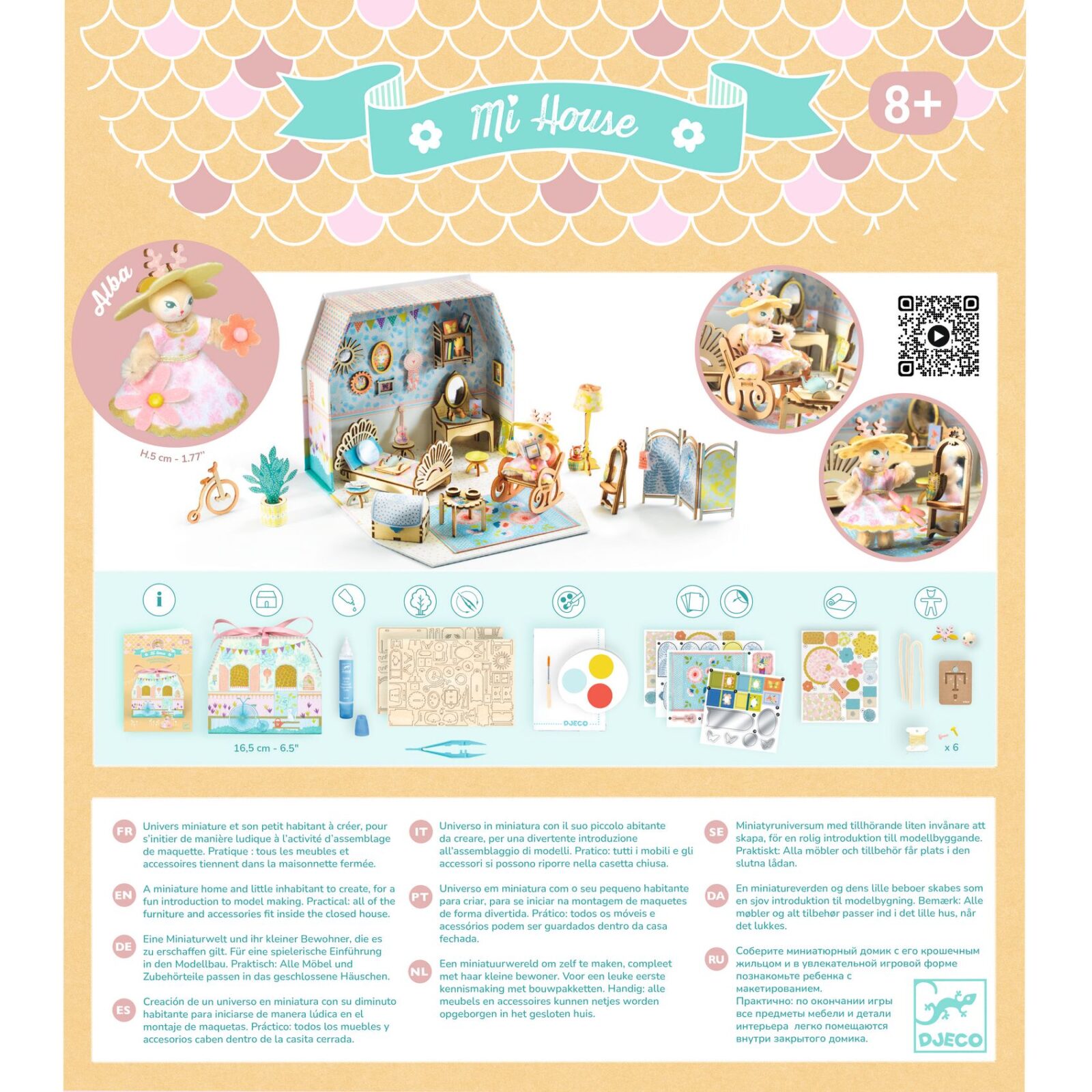 Ett roligt och kreativt miniatyrhus med en liten minikaraktär – Alba. Skapa möbler och tillbehör, som alla får plats i att förvaras i huset då det också kan användas som en jättefin förvaringslåda.
