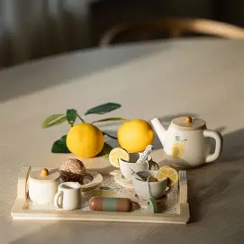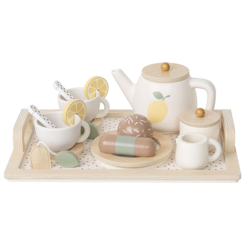 Precis som på en riktig lyxig afternoon tea kan barnet här duka upp med en fin servis utsmyckad med härliga citroner på och bjuda på goda kakor och bakverk till teet.