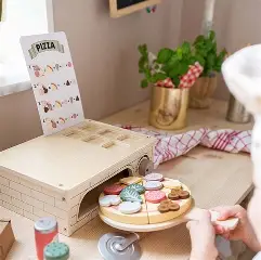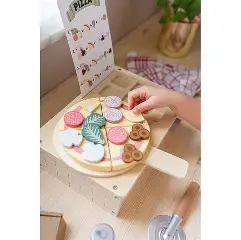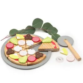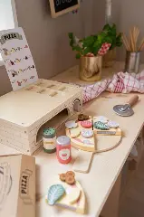 Innehåll:1x pizzaugn i trä, 4x pizzaslices i trä, 1x tomatsås, 1x parmesanost, 1x pizzaslicer i trä, 1x meny, 1x pizzaspade, 1x pizzakartong, 2x svamp, 2x lökringar, 2x slices av peperoni, 2x ananasbitar, 2x oliver, 2x salladsblad.