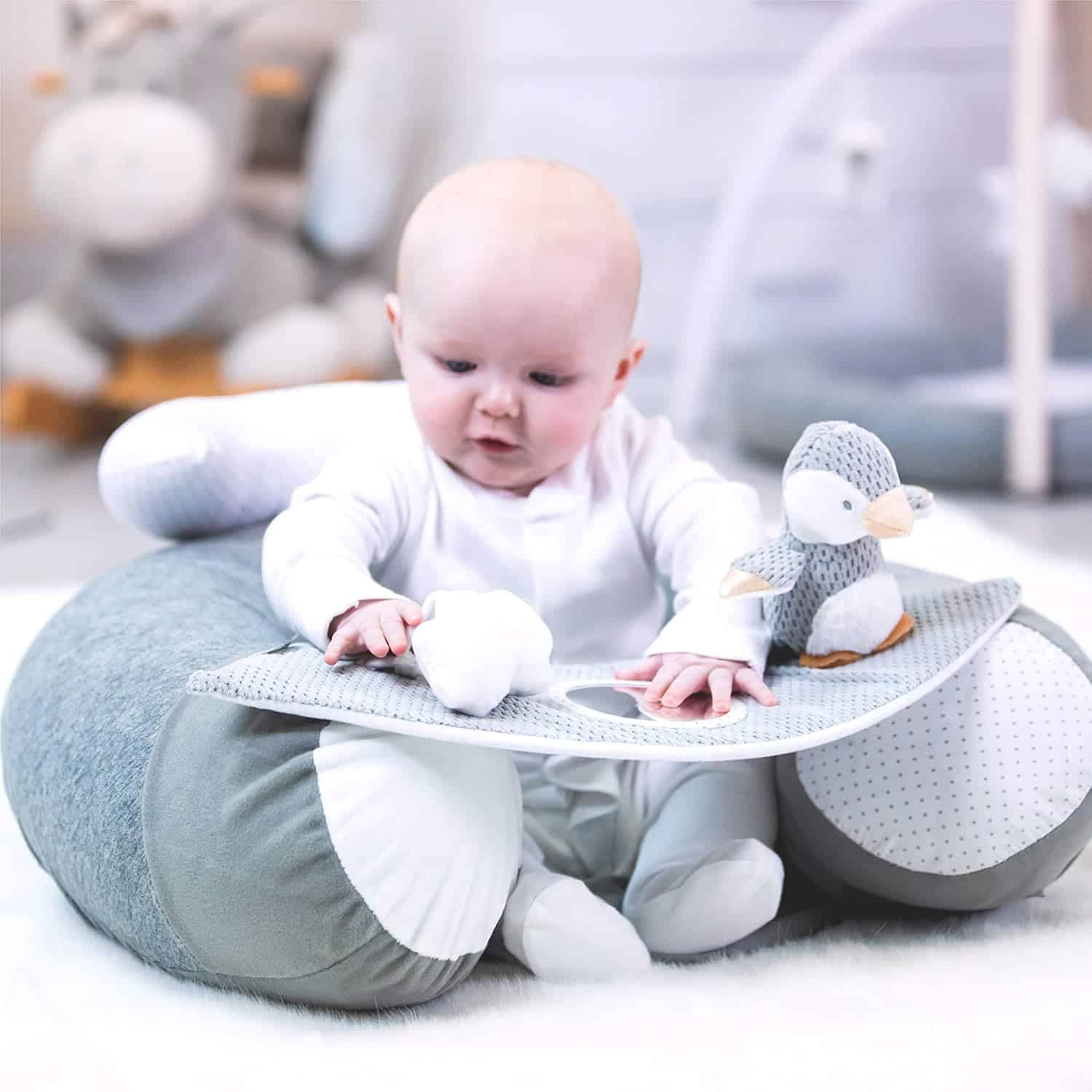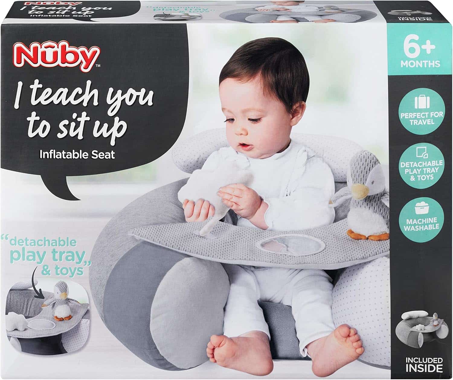 Nuby Sittstöd Little Penguin är en mjuk och trygg sittsupport för bebisar som håller på att lära sig sitta. Den fluffiga designen ger stabilt stöd för huvud och armar, samtidigt som den avtagbara brickan med leksaker håller barnet sysselsatt.