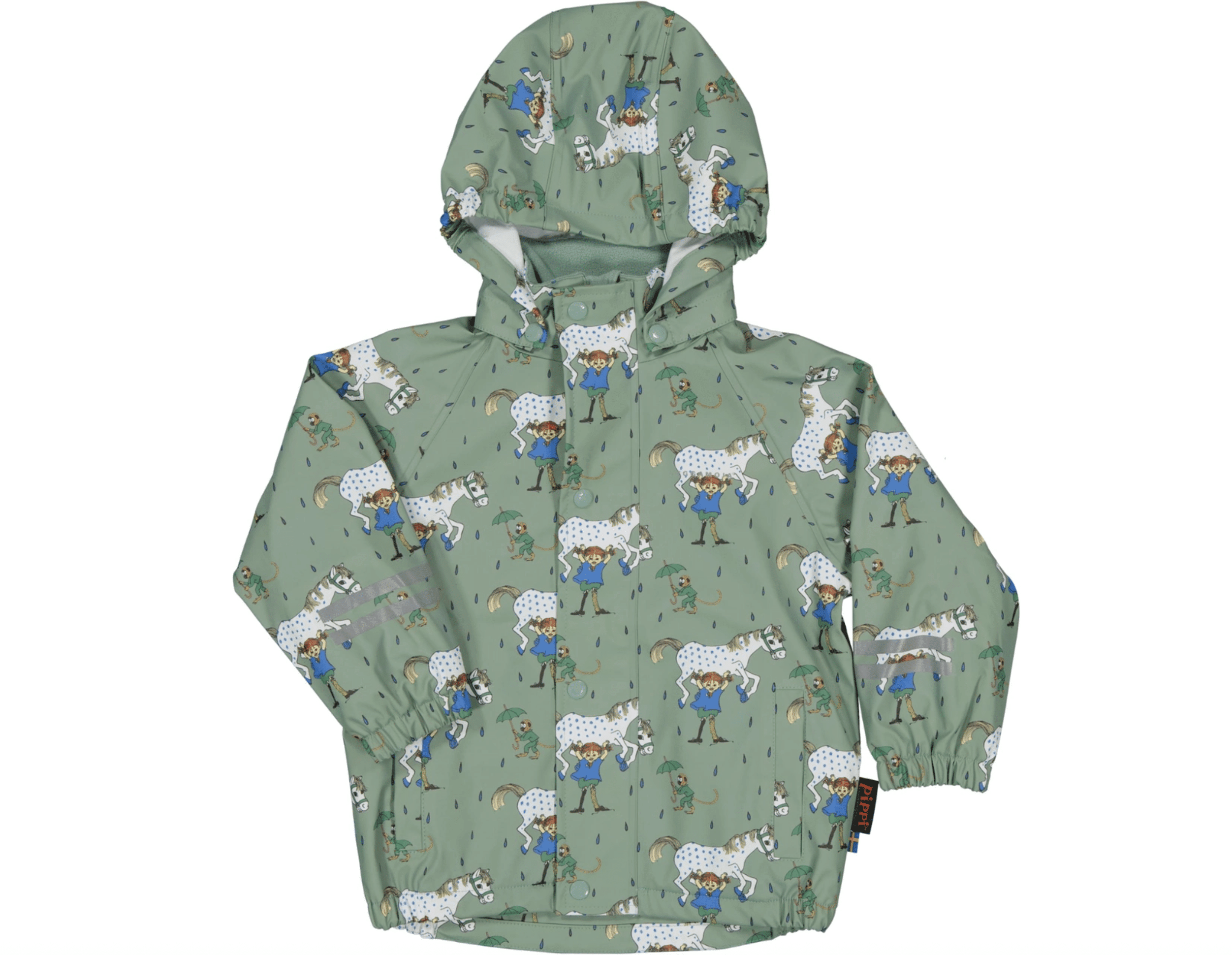 Jackan har en avtagbar luva, praktiska fickor och reflexer, men bäst av allt? En Pippi-reflex på ryggen som gör att barnet syns ordentligt – även när det skymmer.