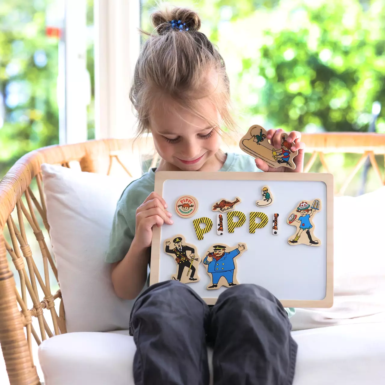 Magneterna kommer i en lekfull mix av färger och Pippi och hennes vänner gör magnetleken ännu roligare. Setet innehåller 55 bokstäver från dom nordiska och tyska alfabeten och 17 figurer. Genom att leka med bokstäver och bygga ihop namn och ord lär barnet känna bokstävernas former och kan öva på uttal och stavning.