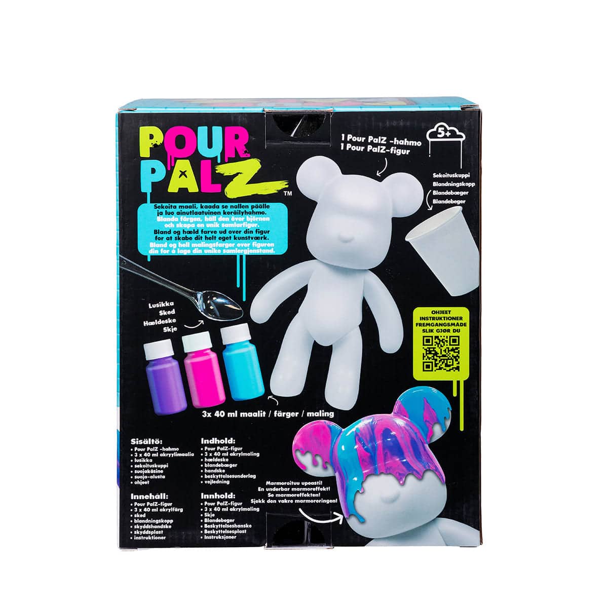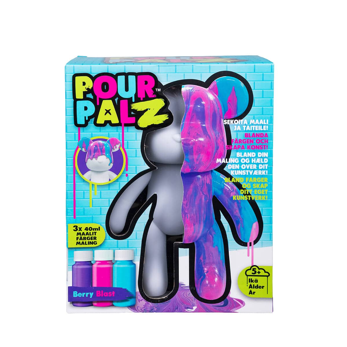 Med Pour Palz Måla Björn Berry Blast får barnet möjlighet att låta kreativiteten flöda och skapa en helt unik samlarfigur. Björnen levereras utan färg, vilket gör att barnet själv kan blanda, hälla och designa figuren precis som man vill.