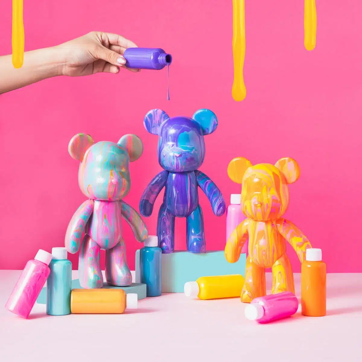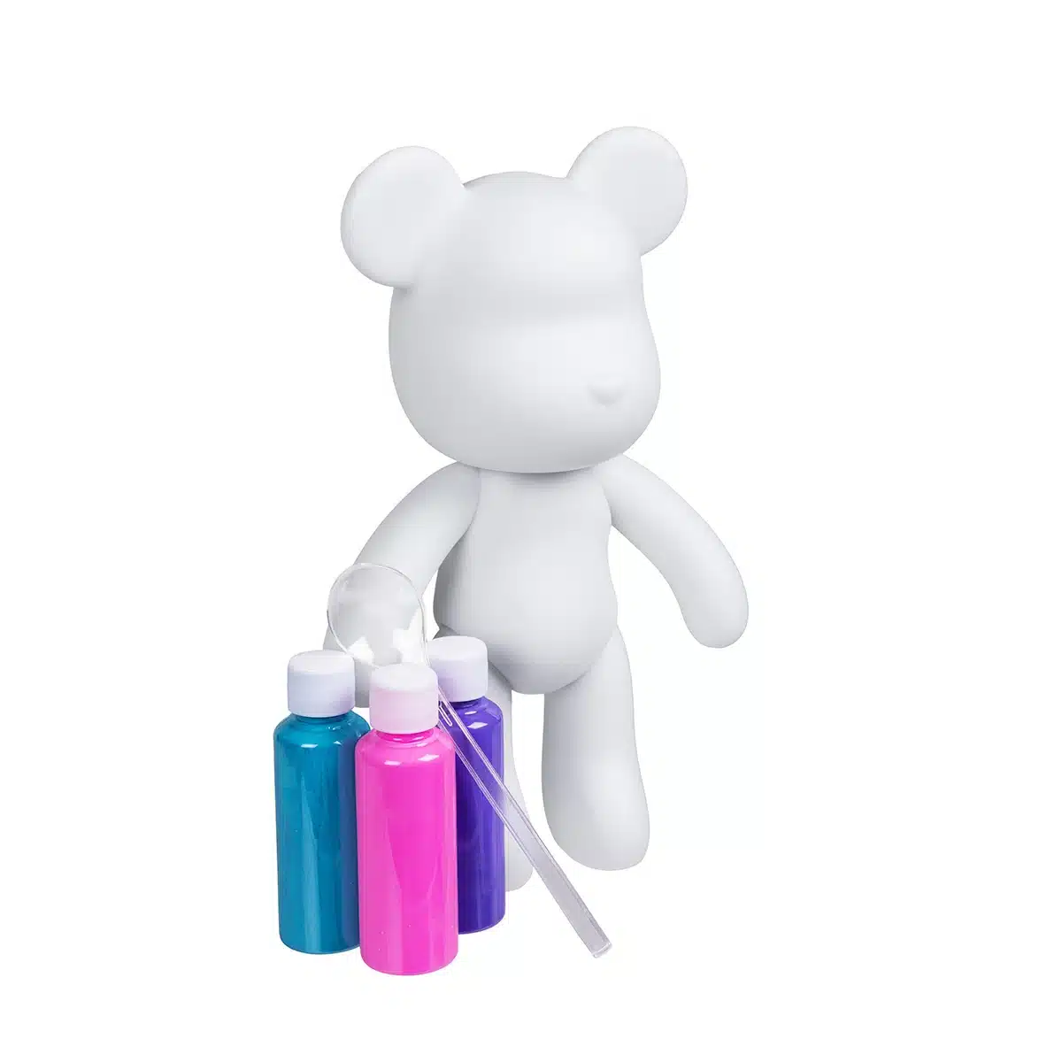 Häll akrylfärgen över figuren och låt den torka – resultatet blir en personlig konstfigur som inte liknar någon annan. Den färdiga björnen är 22 cm hög och tillverkad i slitstark PVC-plast, perfekt att visa upp som samlarobjekt efteråt.