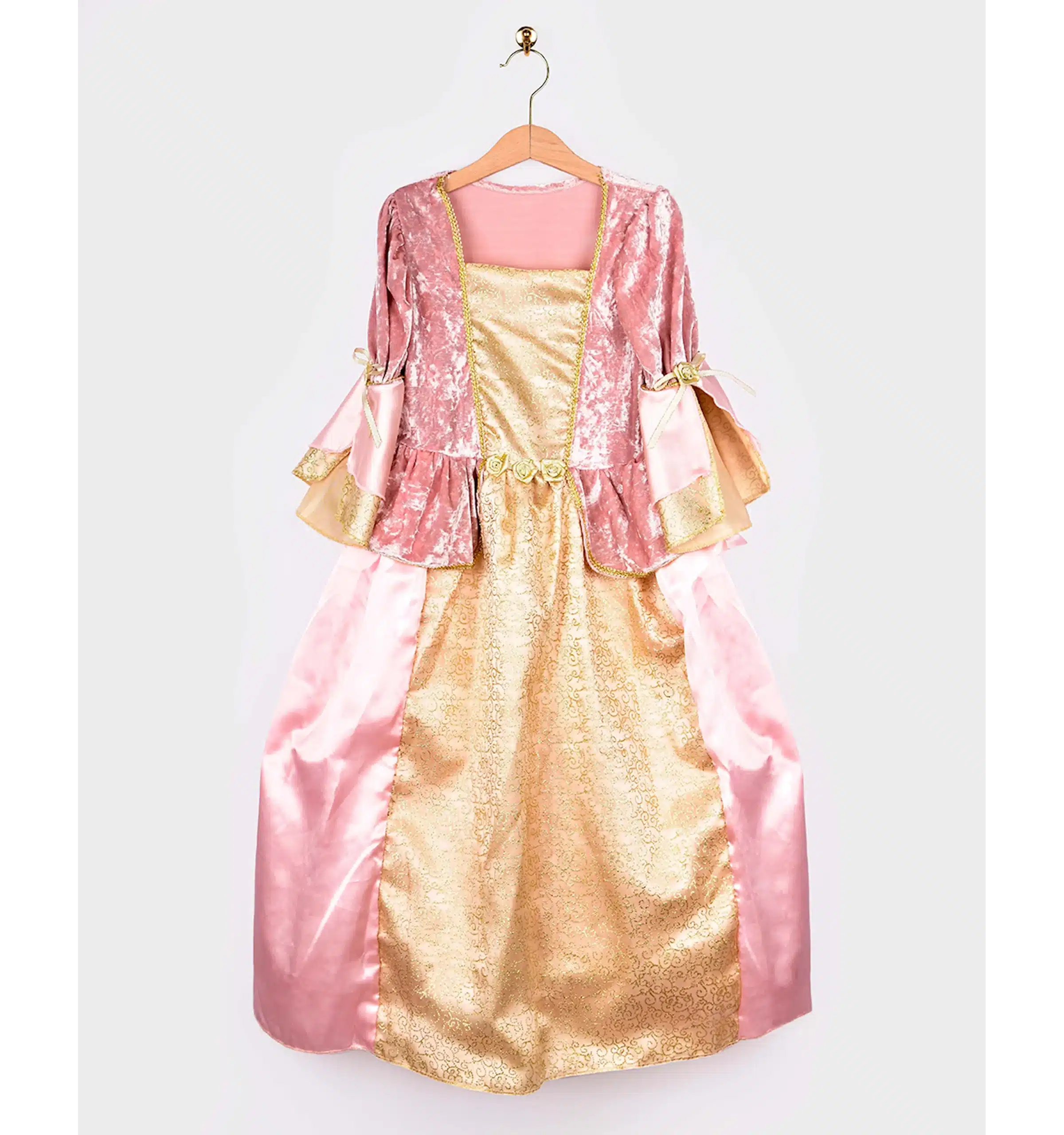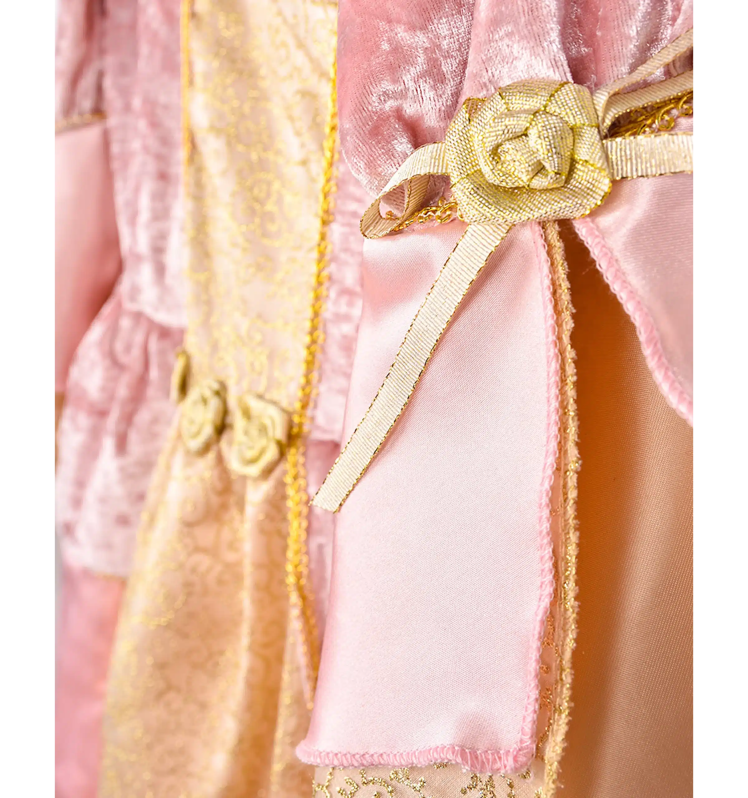 Den klassiska prinsessklänningen är sydd i mjuk rosa sammet med fina detaljer som dekorativa rosor, puffärmar och ett elegant vitt satängparti framtill. Designen ger en kunglig känsla och gör klänningen extra speciell.
