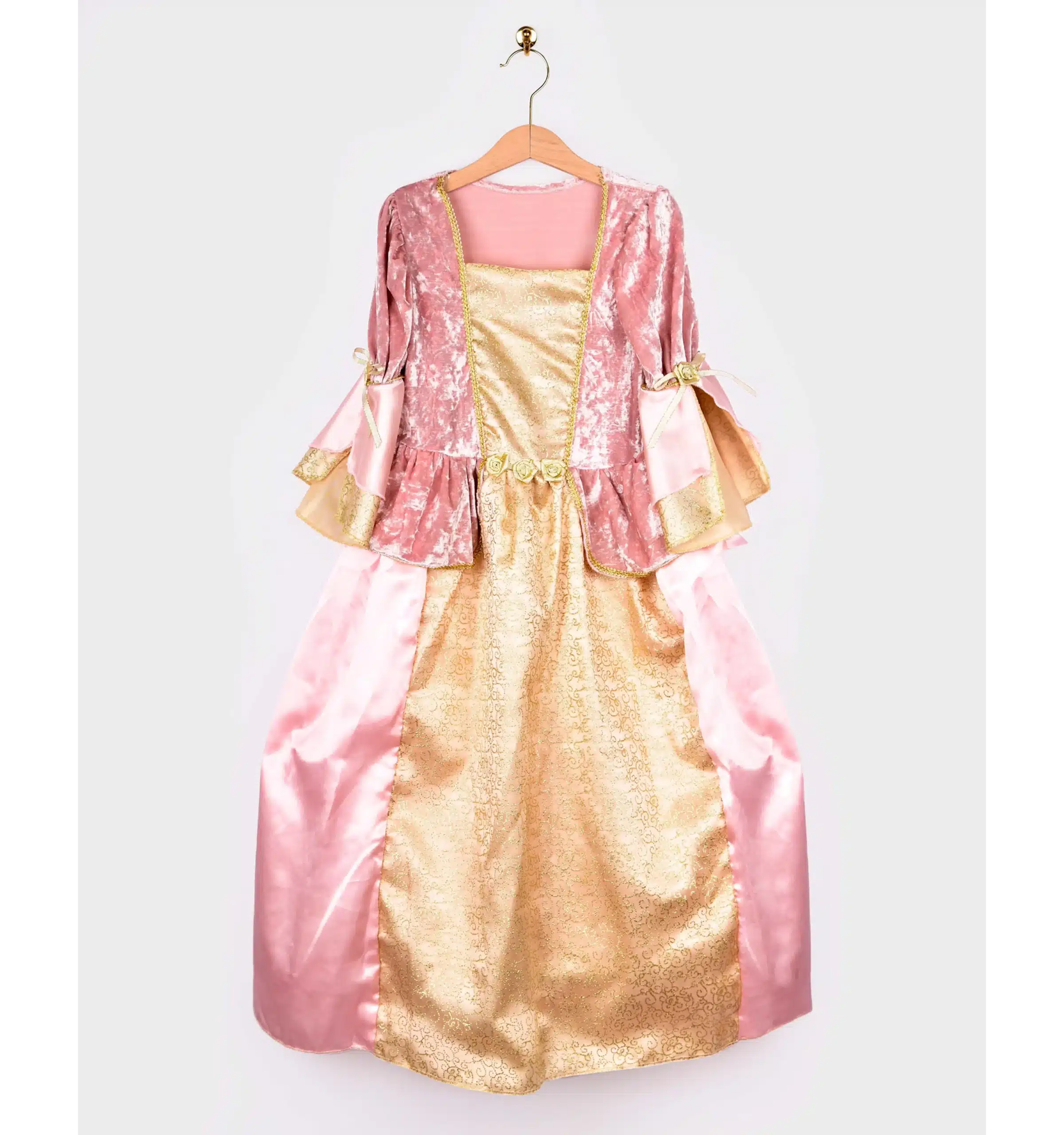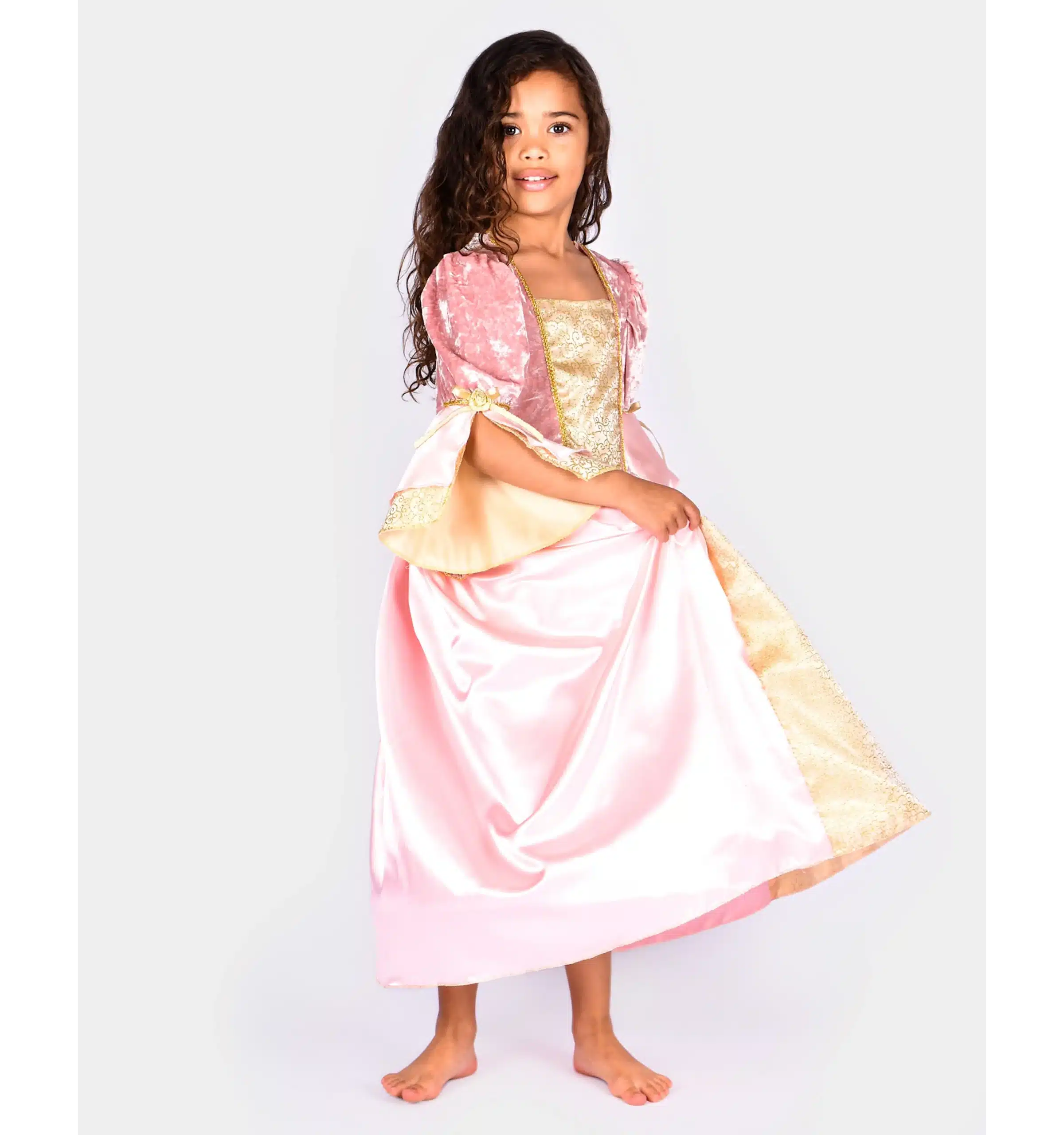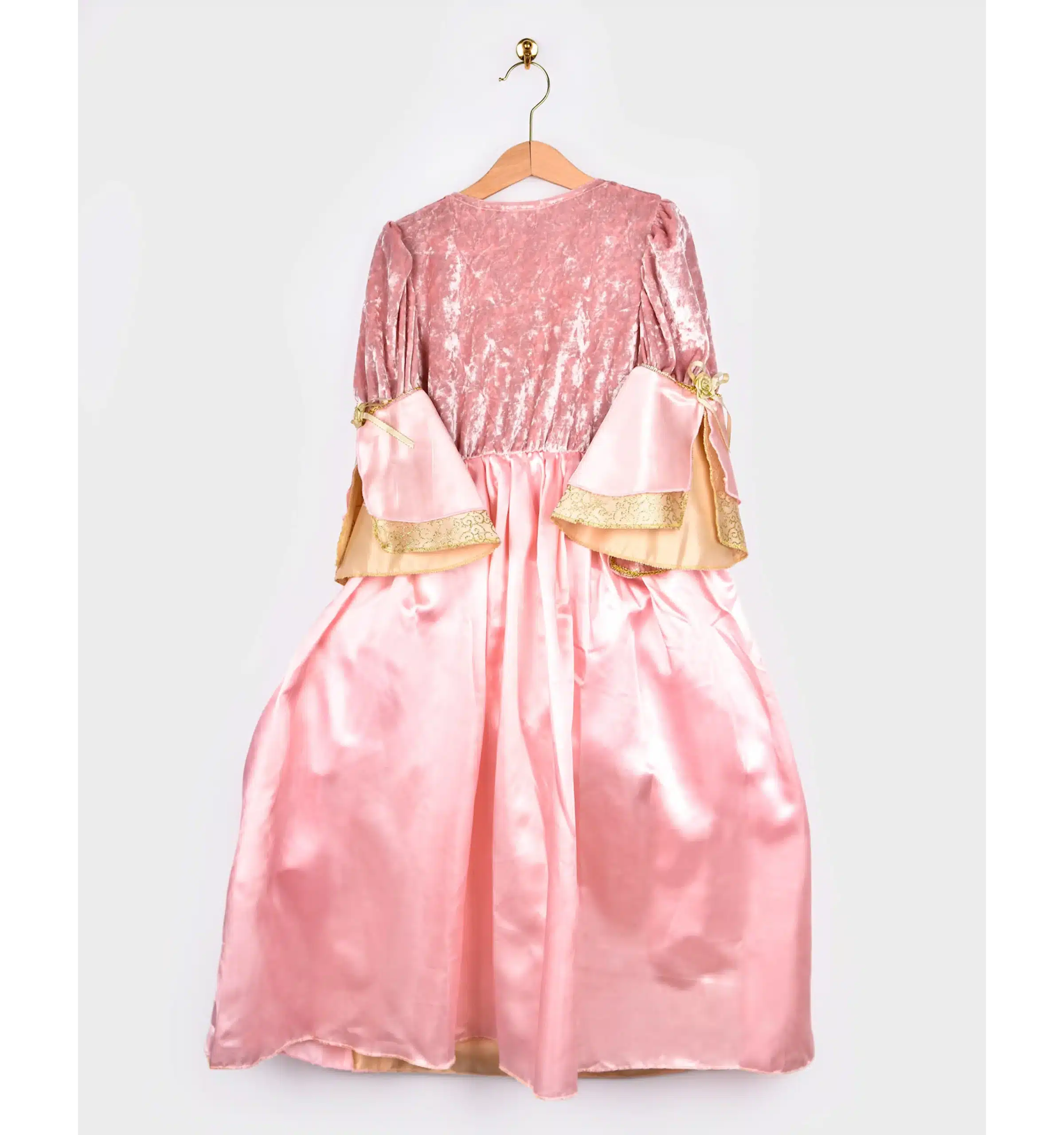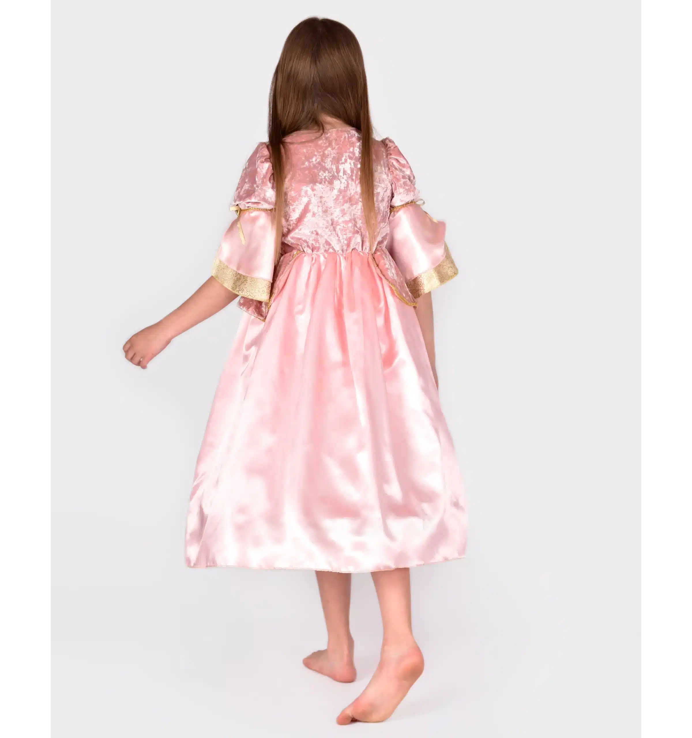 Den klassiska prinsessklänningen är sydd i mjuk rosa sammet med fina detaljer som dekorativa rosor, puffärmar och ett elegant vitt satängparti framtill. Designen ger en kunglig känsla och gör klänningen extra speciell.