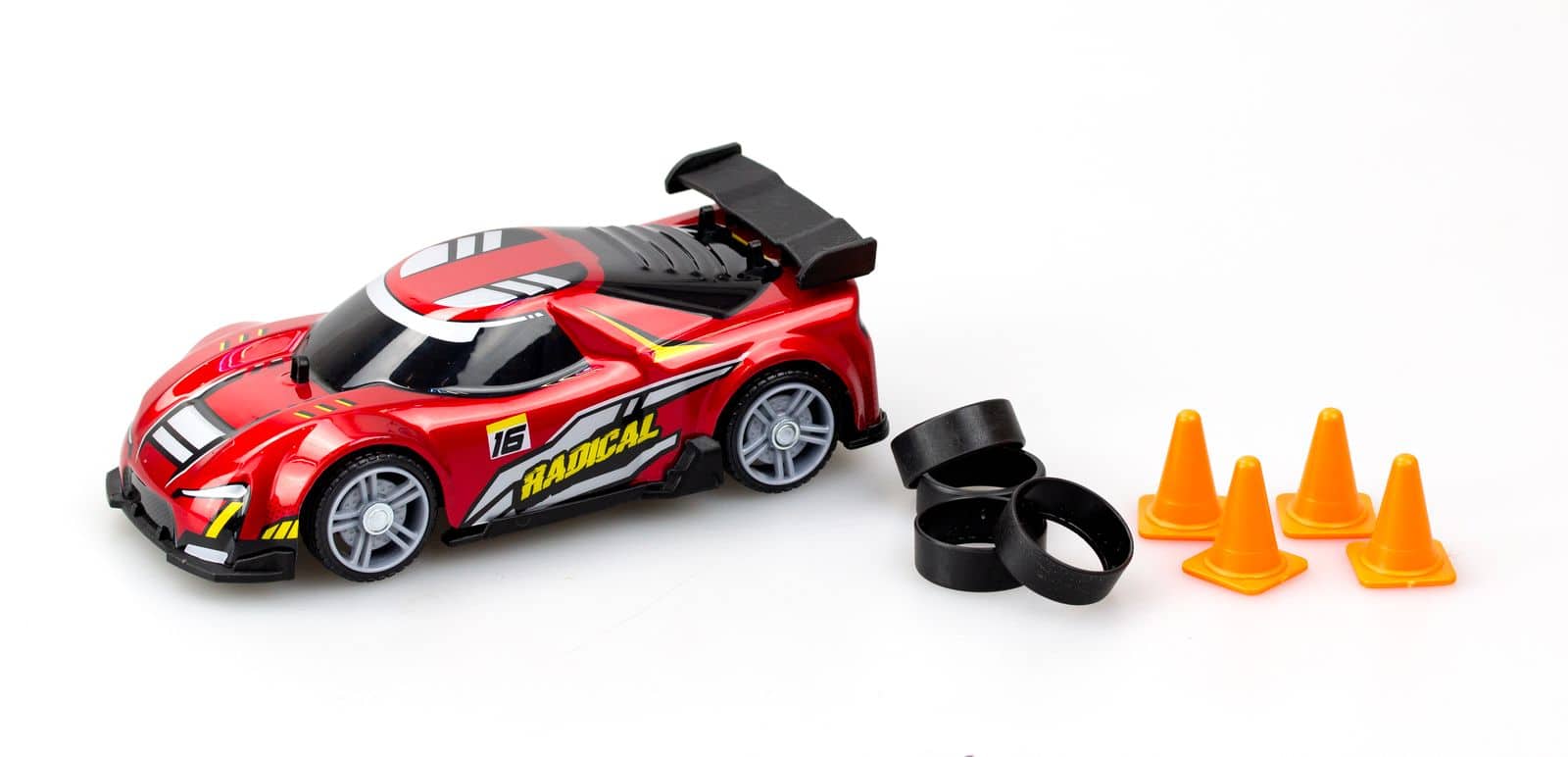Utmana dina vänner med häftiga driftutmaningar! Montera de medföljande drifthjulen och använd konerna för att designa din egen bana. Med den medföljande 2.4GHz-sändaren kan du smidigt växla mellan två hastighetslägen för att hitta den perfekta farten för din körstil.